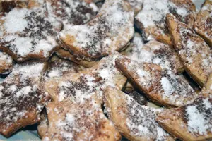 Cream together 270g (about 1.2 cups) of butter. Add 500g (about 4 cups) of flour, 2 eggs, 150g (about 1.5 cups) of finely chopped almonds or other nuts, 20g (about 2 tablespoons) of ground cinnamon, the grated zest of one lemon, and 250g (about 2 cups) of powdered sugar. Mix until well combined. Cover the dough with a cloth and let it rest in a cool place for a day.
