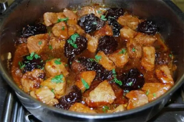 Ingredients: 1.2 kg (about 2.6 lbs) of beef, 100 g (about 3.5 oz) of fat, 200 g (about 7 oz) of onions, 150 g (about 5.3 oz) of tomato paste, and 300 g (about 10.6 oz) of prunes.
